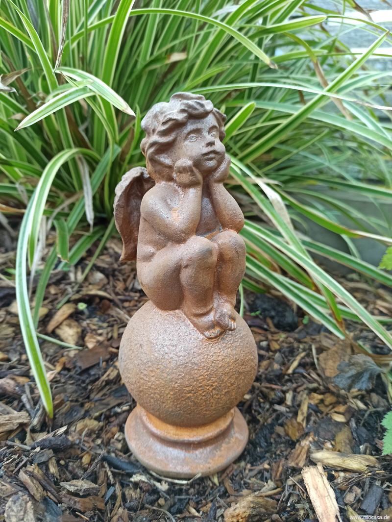Die Figuren aus Gusseisen sind naturbelassen und mit einer Naturrostpatina versehen. Im Freien werden sie langsam oberflächlich weiter rosten und im Farbton etwas dunkler werden.