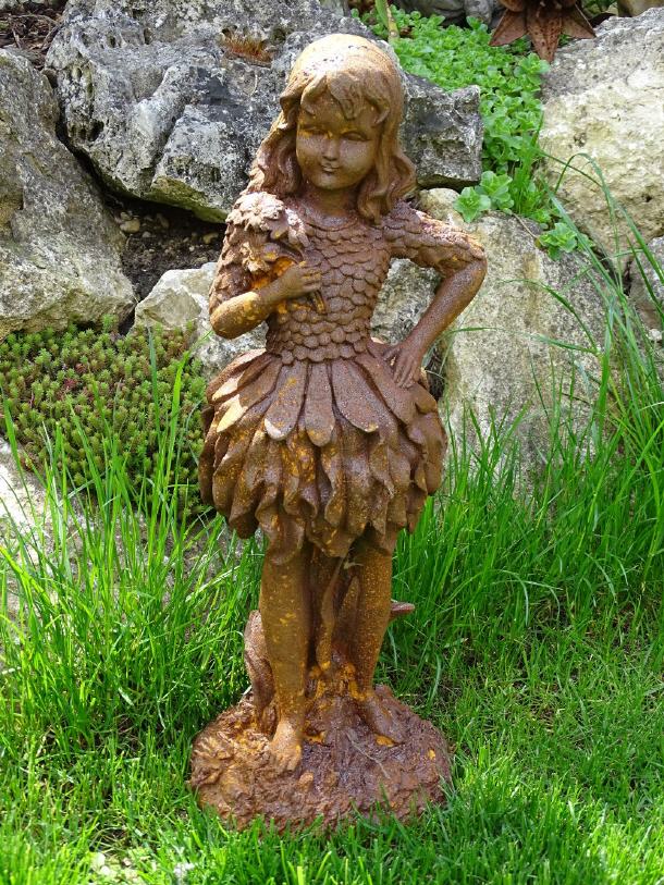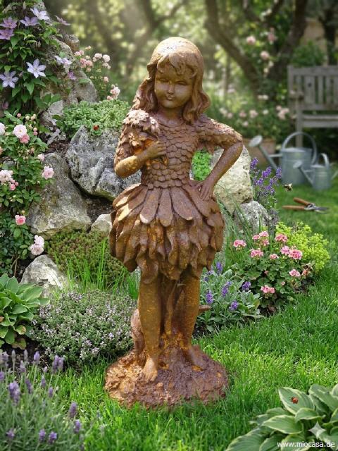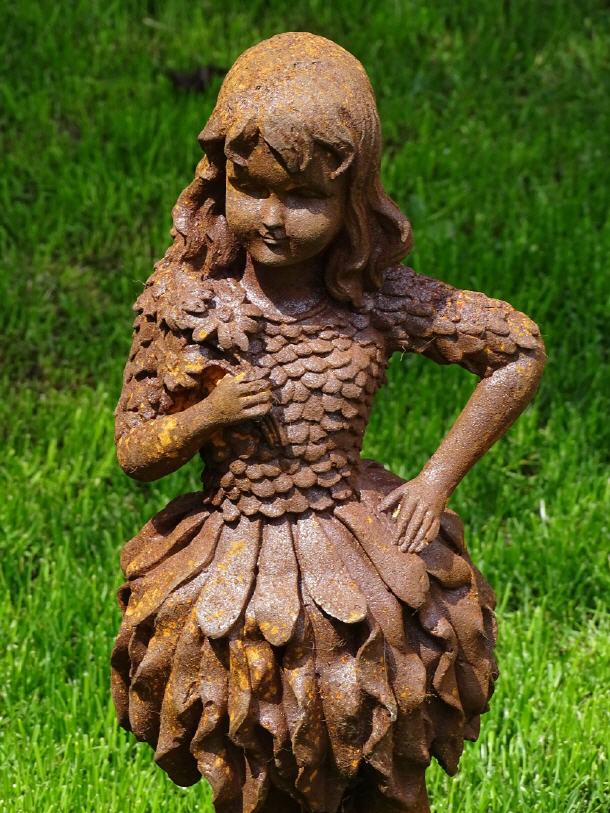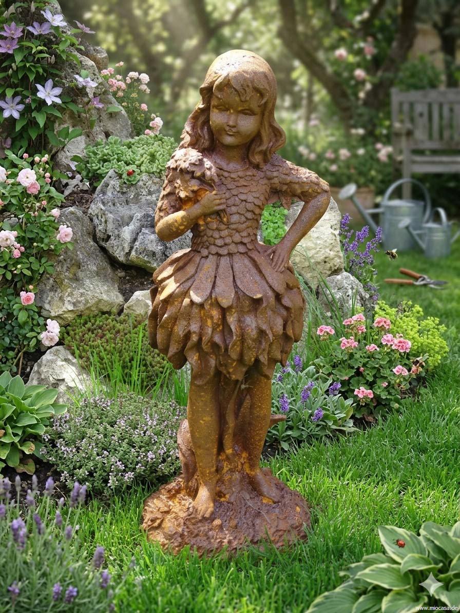 Die Figuren aus Gusseisen sind naturbelassen und mit einer Naturrostpatina versehen. Im Freien werden sie langsam oberflächlich weiter rosten und im Farbton etwas dunkler werden.