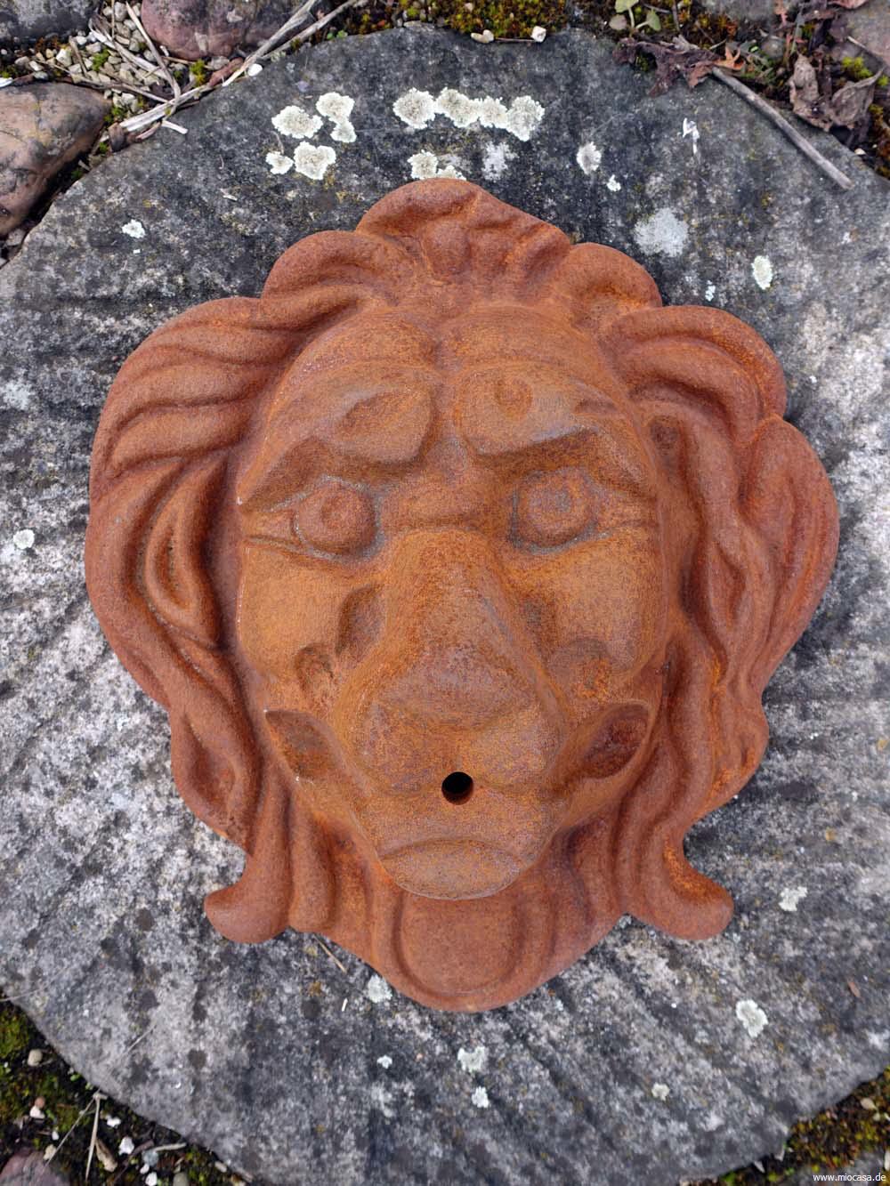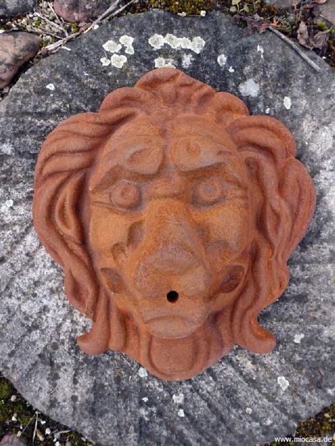 Der Löwenkopf besitzt keine Aufhängevorrichtung an der Rückseite. Diese muss selbst angebracht werden. Alternativ kann das Löwengesicht auch direkt in die Wand eingemauert werden.