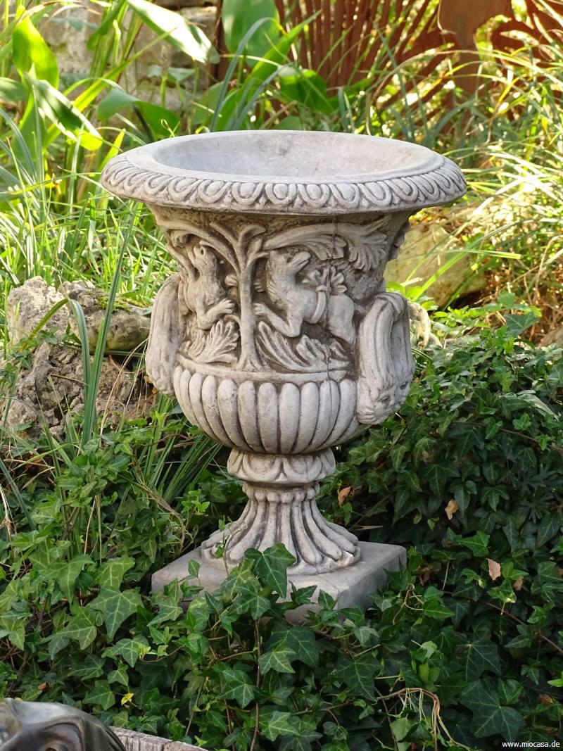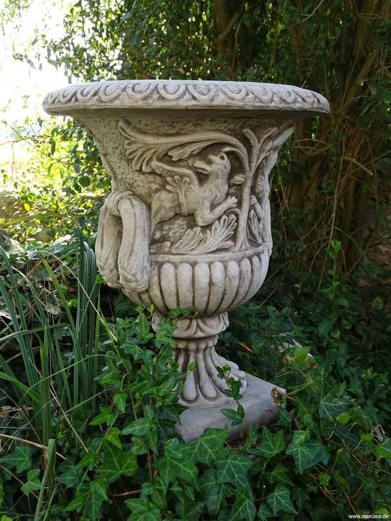 Beim englischen Antik-Steinguss handelt es sich um einen Guss aus gemahlenem Stein mit Beton vermischt. Das Gemisch wird in eine Form gegossen, anschließend von Hand sauber nachgearbeitet und die Oberflächen von Hand antik-grau patiniert. Die Figuren aus Antiksteinguss sind frostfest.