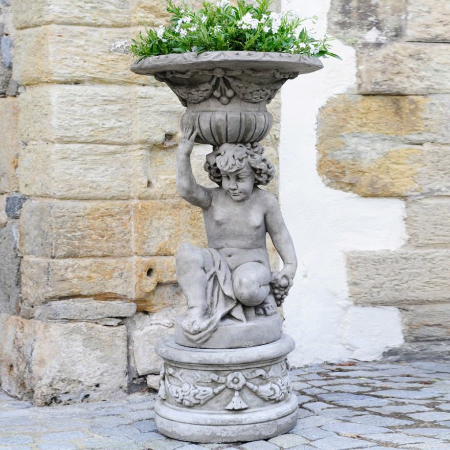 Beim englischen Antik-Steinguss handelt es sich um einen Guss aus gemahlenem Stein mit Beton vermischt. Das Gemisch wird in eine Form gegossen, anschließend von Hand sauber nachgearbeitet und die Oberflächen von Hand antik-grau patiniert. Die Figuren aus Antiksteinguss sind frostfest.