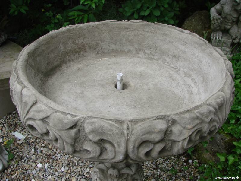Sowohl die Schale als auch der Fuß besitzen eine Bohrung. Hier kann das Wasser ablaufen. Umgekehrt wäre es auch möglich, das Becken als Springbrunnen zu verwenden. Dazu müsste die Schale beim Loch nur entsprechend abgedichtet werden.