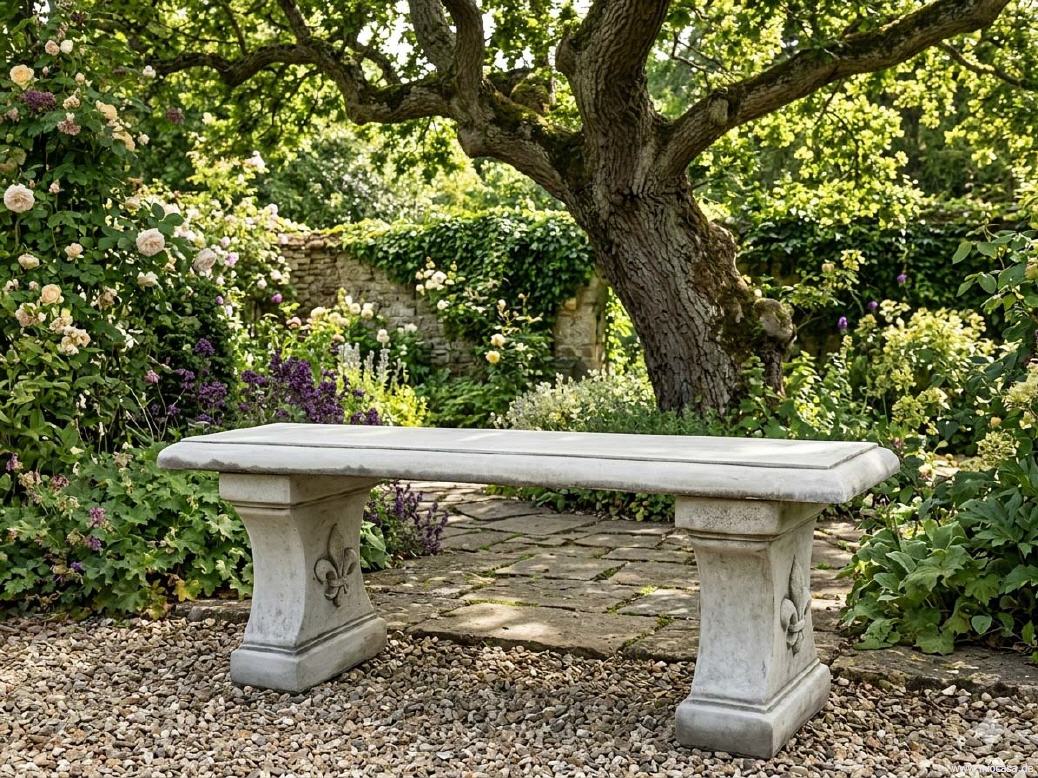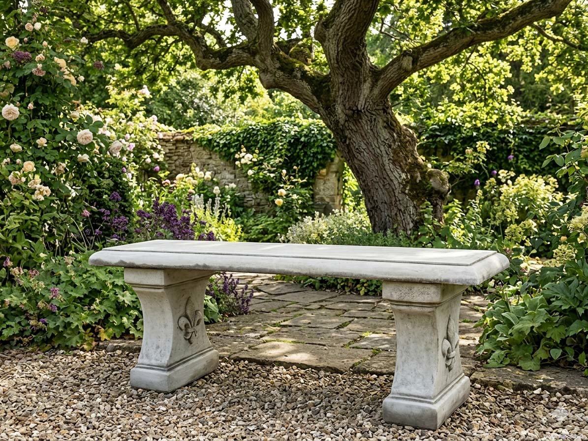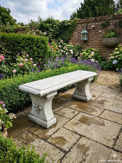 Frostfeste Stein-Sitzbank aus englischem Steinguss, hand-patiniert.