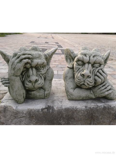 Beim Steinguss handelt es sich um einen Guss aus gemahlenem Stein mit Beton vermischt. Das Gemisch wird in eine Form gegossen, anschließend von Hand sauber nachgearbeitet und die Oberflächen von Hand patiniert. Die Figuren aus Steinguss sind frostfest.
