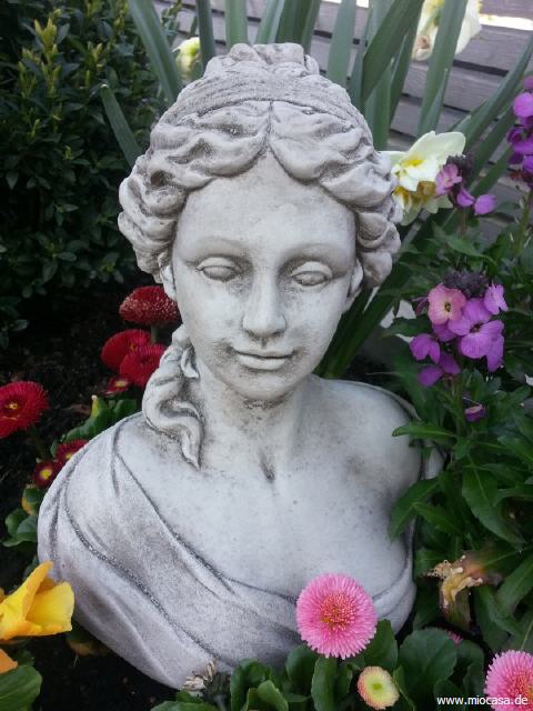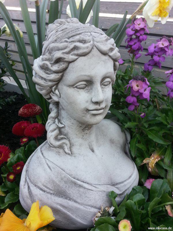 Im Freien unterliegen sie aber der normalen Verwitterung, d.h. es können sich im Schattenbereich Flechten und Moose bilden. Bedenken Sie dies, gerade wenn Sie auch im Winter Ihre Figuren ungeschützt im Freien stehen lassen. Achten sie bei Frost darauf, dass sich in Vertiefungen kein Wasser sammeln kann und dann gefriert. Wasserbecken, Brunnen und Tränken müssen bei Frost entleert und abgedeckt werden. Alle Vasen, Amphoren und Pflanztöpfe besitzen ein Ablaufloch für Wasser und müssen im Winter deshalb nicht abgedeckt werden. Im Winter sollen alle Steingussprodukte so platziert werden, dass Wasser darunter versickern kann. Nicht in Wasserpfützen oder gar am Teichrand stehen lassen.