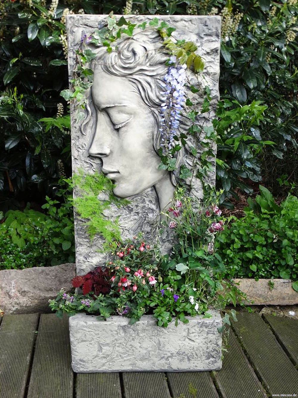 Beim Steinguss handelt es sich um einen Guss aus gemahlenem Stein mit Beton vermischt. Das Gemisch wird in eine Form gegossen, anschließend von Hand sauber nachgearbeitet und die Oberflächen von Hand patiniert. Die Figuren aus Steinguss sind frostfest.
