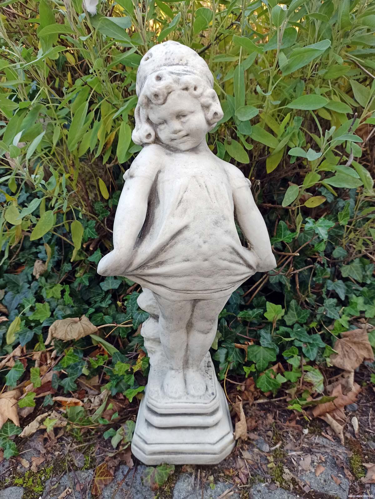 Beim englischen Antik-Steinguss handelt es sich um einen Guss aus gemahlenem Stein mit Beton vermischt. Das Gemisch wird in eine Form gegossen, anschließend von Hand sauber nachgearbeitet und die Oberflächen von Hand antik-grau patiniert. Die Figuren aus Antiksteinguss sind frostfest.