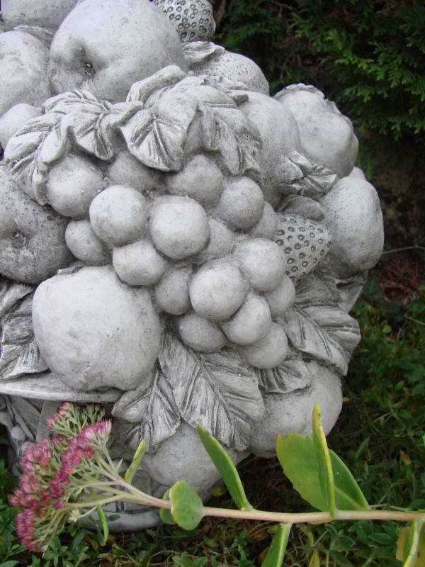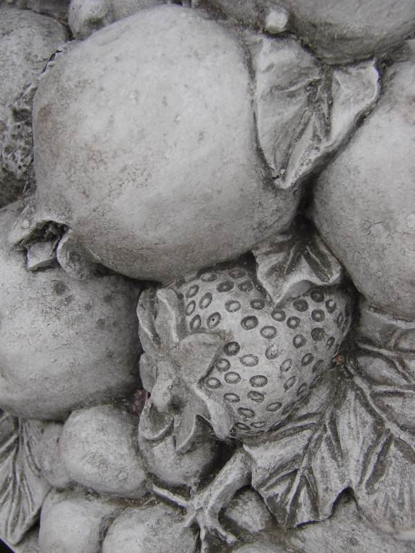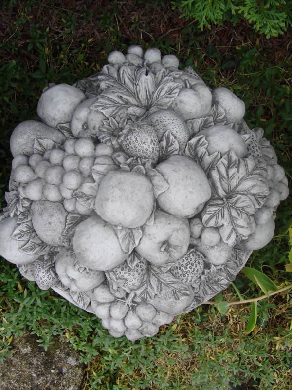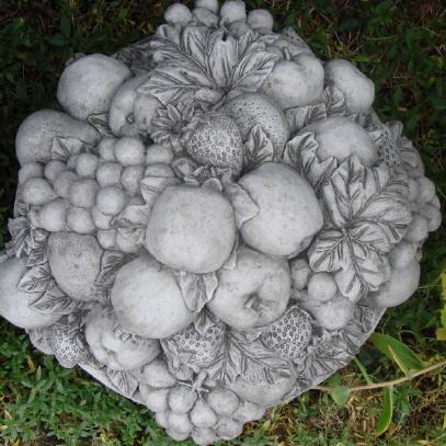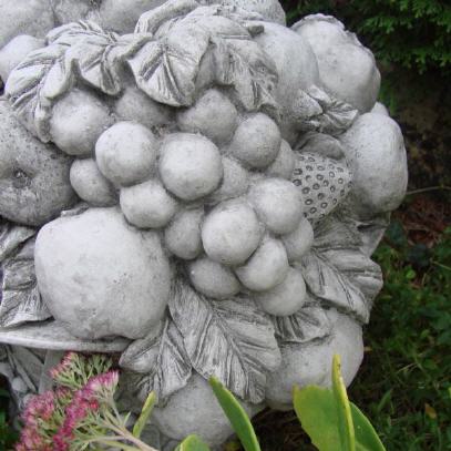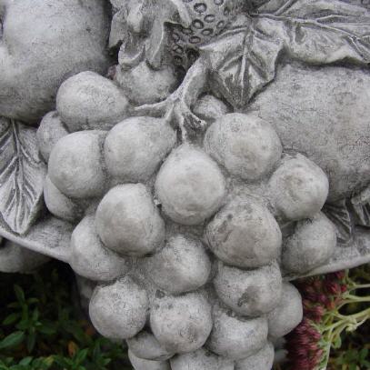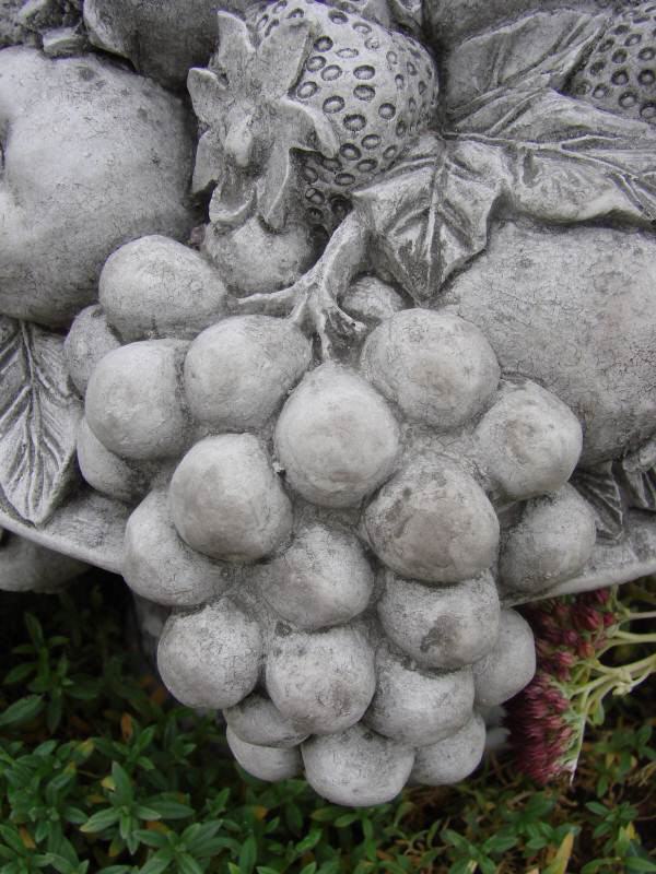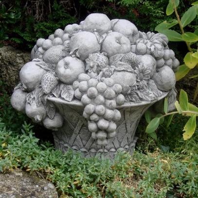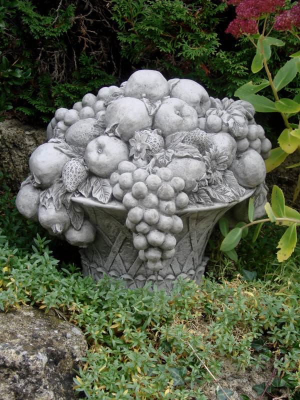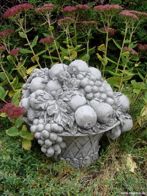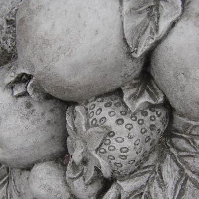 Dieser üppig mit Früchten beladene Flechtkorb wird aus frostfestem Steinguss in Handarbeit produziert. Der Fruchtkorb ist die ideale Dekoration auf Pfeilerabsätzen, Ballustraden oder Gartentischen.