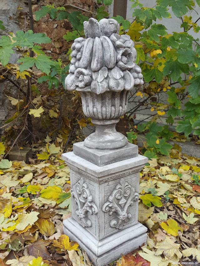 Beim englischen Antik-Steinguss handelt es sich um einen Guss aus gemahlenem Stein mit Beton vermischt. Das Gemisch wird in eine Form gegossen, anschließend von Hand sauber nachgearbeitet und die Oberflächen von Hand antik-grau patiniert. Die Figuren aus Antiksteinguss sind frostfest.