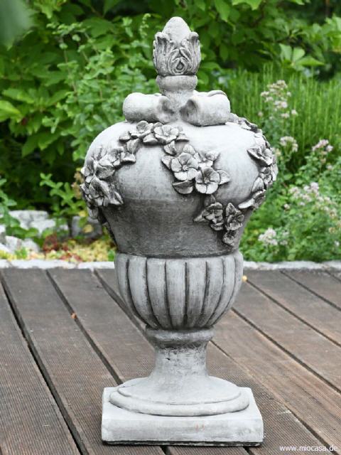 Beim englischen Antik-Steinguss handelt es sich um einen Guss aus gemahlenem Stein mit Beton vermischt. Das Gemisch wird in eine Form gegossen, anschließend von Hand sauber nachgearbeitet und die Oberflächen von Hand antik-grau patiniert. Die Figuren aus Antiksteinguss sind frostfest.