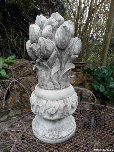 Beim englischen Antik-Steinguss handelt es sich um einen Guss aus gemahlenem Stein mit Beton vermischt. Das Gemisch wird in eine Form gegossen, anschließend von Hand sauber nachgearbeitet und die Oberflächen von Hand antik-grau patiniert. Die Figuren aus Antiksteinguss sind frostfest.