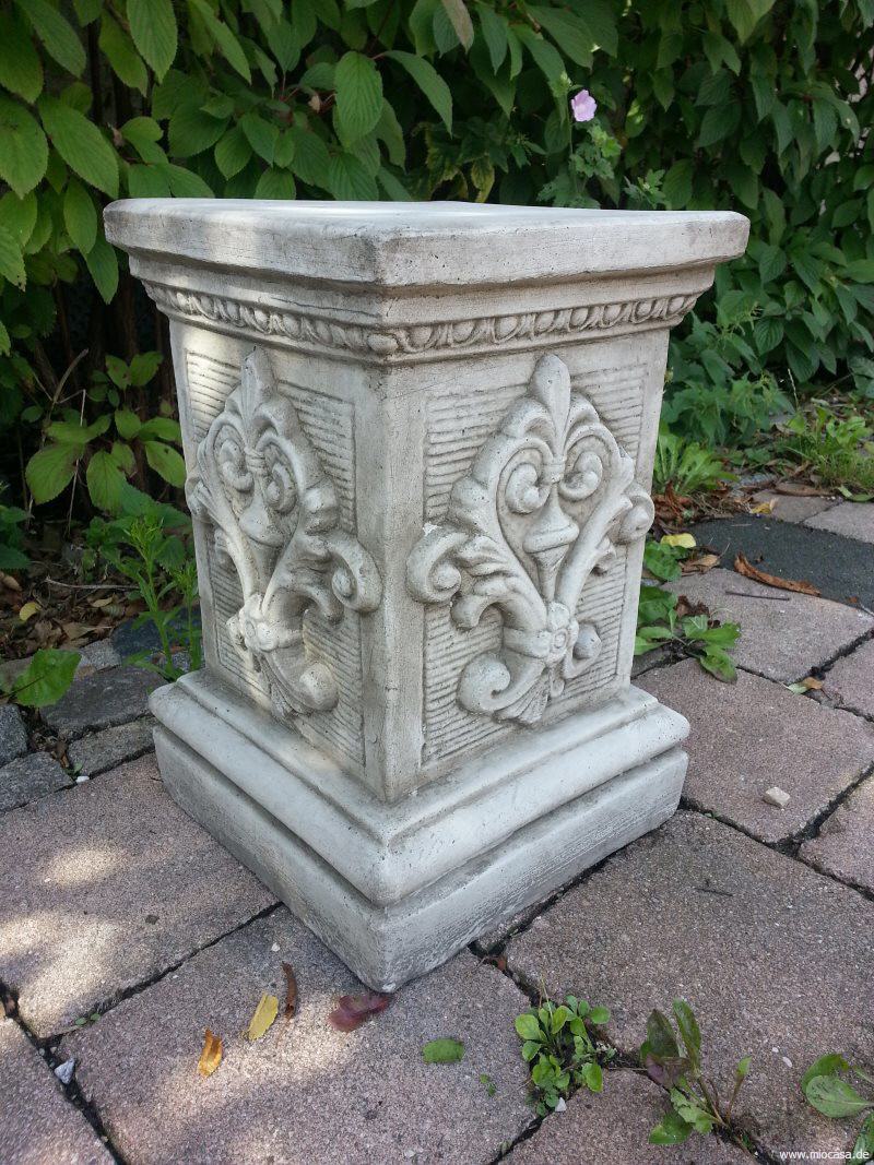 Sockel, Säule verziert aus Steinguss, antik patiniert.