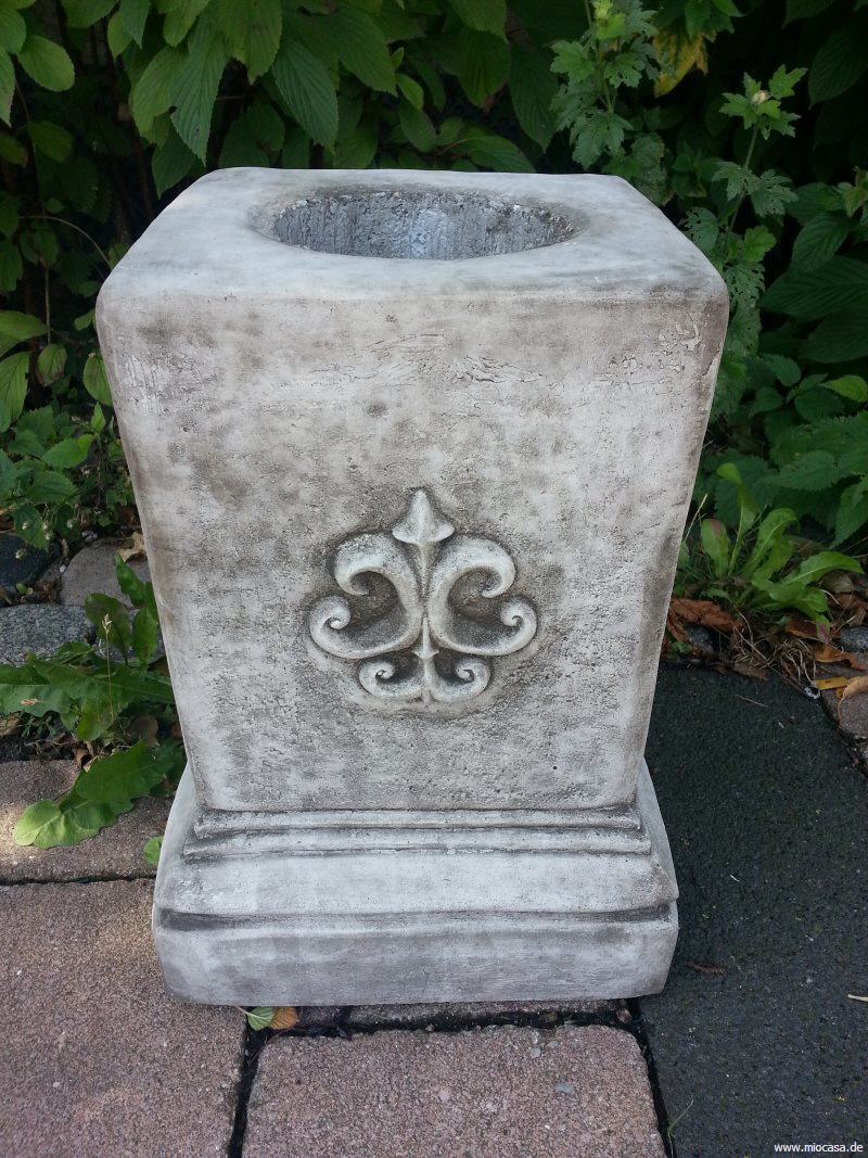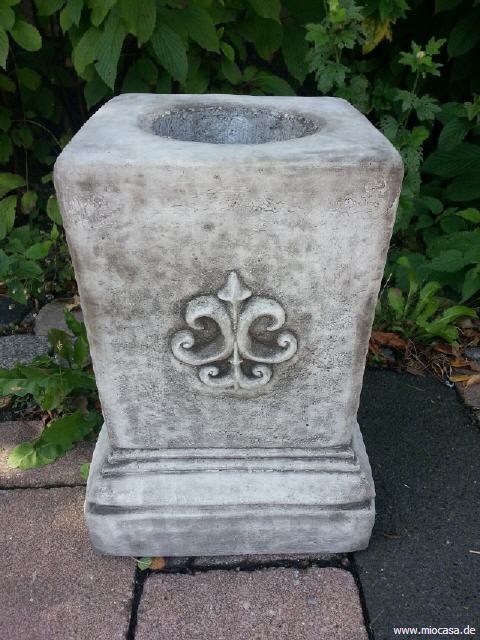 Sockel mit Lilie aus Steinguss, antik patiniert.
