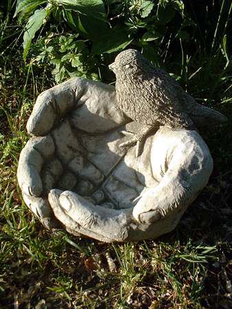 Traumhafte Vogeltränke mit fein gefiedertem Vogel auf Händen.