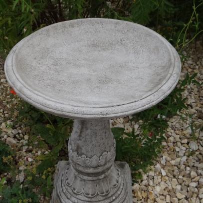 Das Vogelbad wurde in Handarbeit aus englischem Antiksteinguss hergestellt. Die Vogeltränke wird 2-teilig geliefert. Die Wasserschale kann (muss aber nicht) mit Silikon auf dem Standfuß fixiert werden. Durch das hohe Gewicht ist dies aber nicht unbedingt notwendig. Im Winter sollte man das Wasserbecken eisfrei halten.