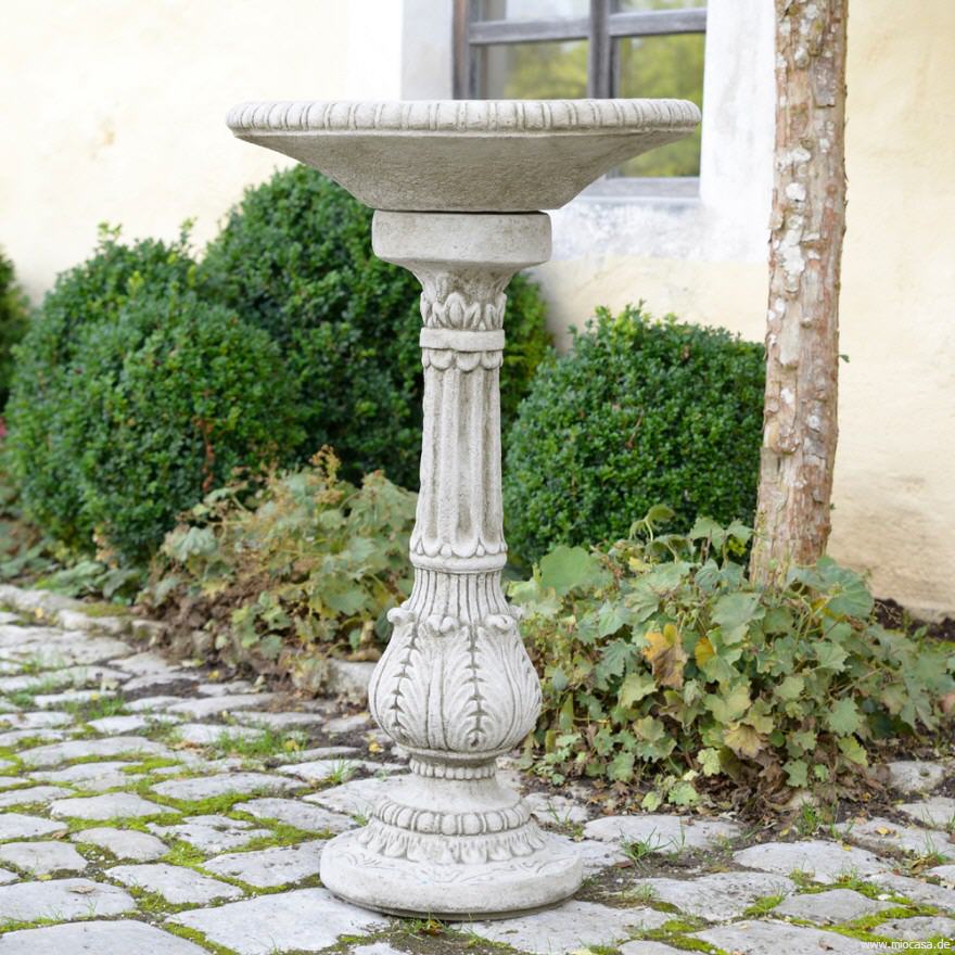 Das Vogelbad wurde in Handarbeit aus englischem Antiksteinguss hergestellt. Die Vogeltränke wird 2-teilig geliefert. Die Wasserschale kann (muss aber nicht) mit Silikon auf dem Standfuß fixiert werden. Durch das hohe Gewicht ist dies aber nicht unbedingt notwendig. Im Winter sollte man das Wasserbecken eisfrei halten.